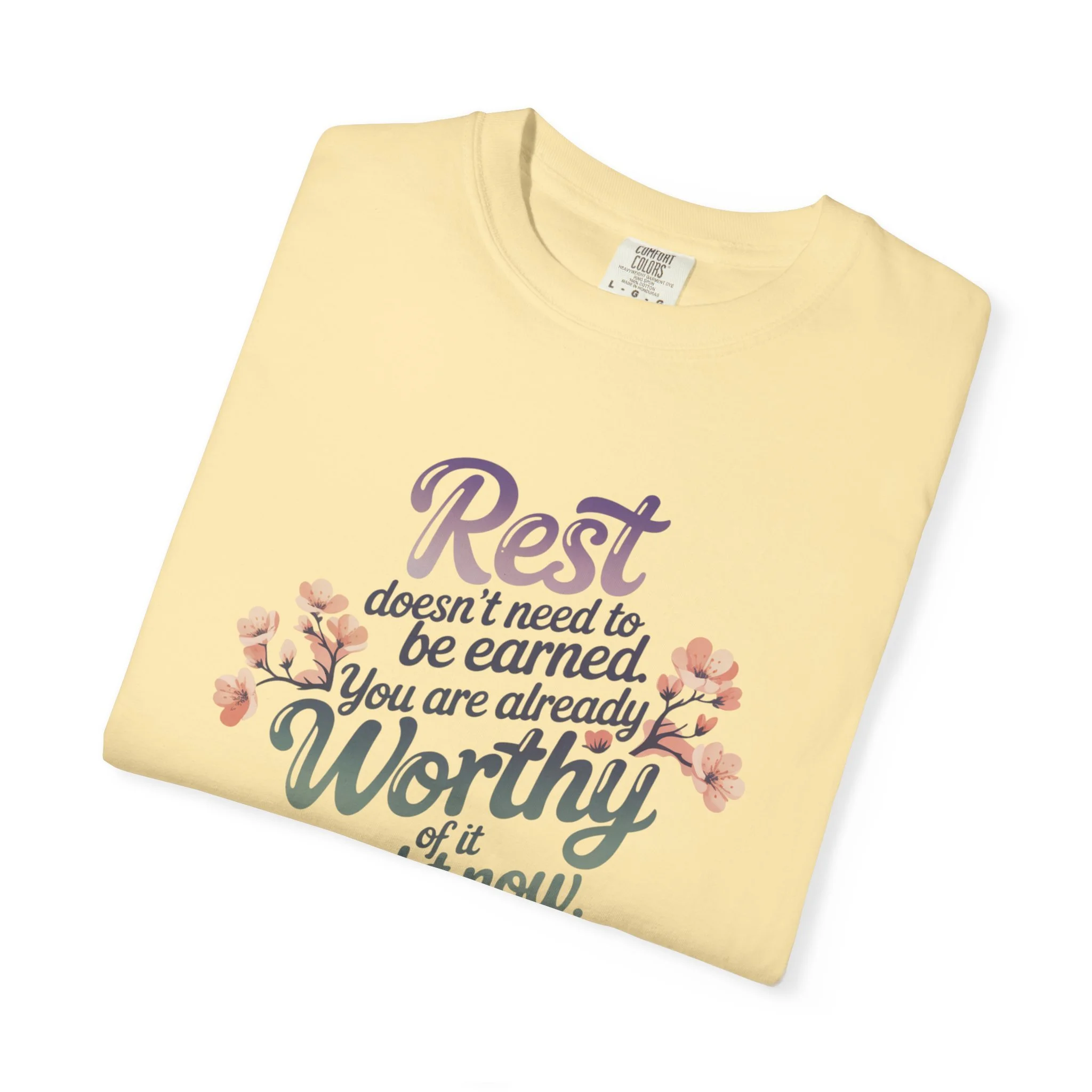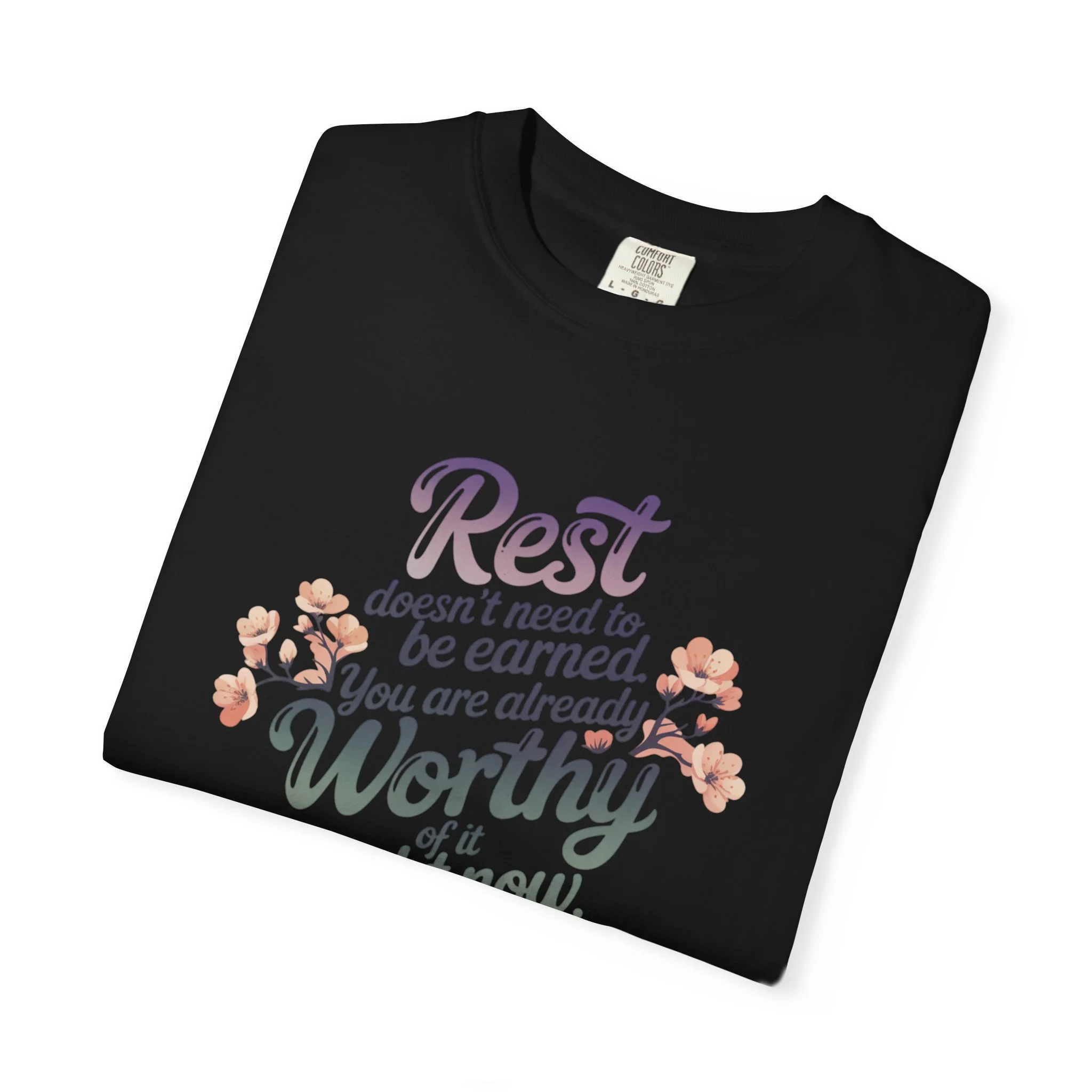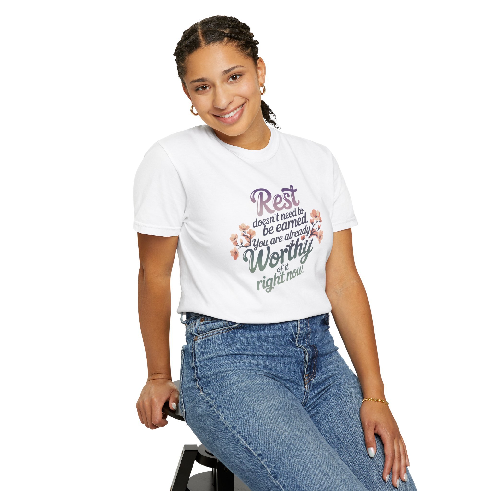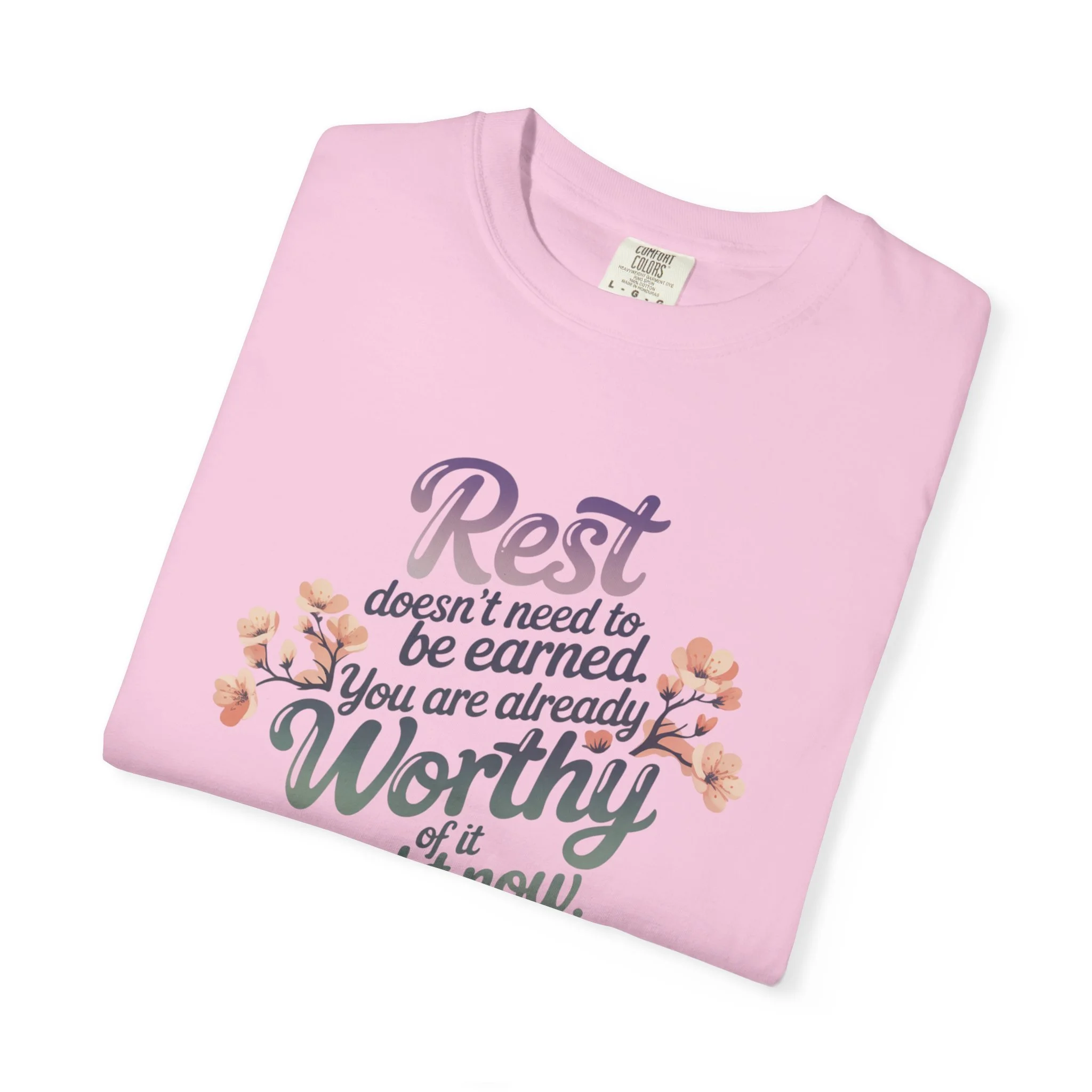 Introducing the ultimate Unisex Garment-Dyed T-shirt, perfect for those who value comfort and stylish expression. This soft and inviting tee creates a relaxed vibe that seamlessly fits into your everyday life, whether you're lounging at home or meeting friends. Designed for anyone who embraces casual chic, it makes a thoughtful gift for birthdays or any occasion that calls for a little self-care. Celebrate yourself and the beauty of rest; this shirt is a reminder that you are worthy of taking a break—ideal for Wellness Days, Mental Health Awareness Month, or simply as a reminder during busy times. Available for both men and women, this versatile tee enhances any wardrobe with its comforting presence and classic crew neckline.