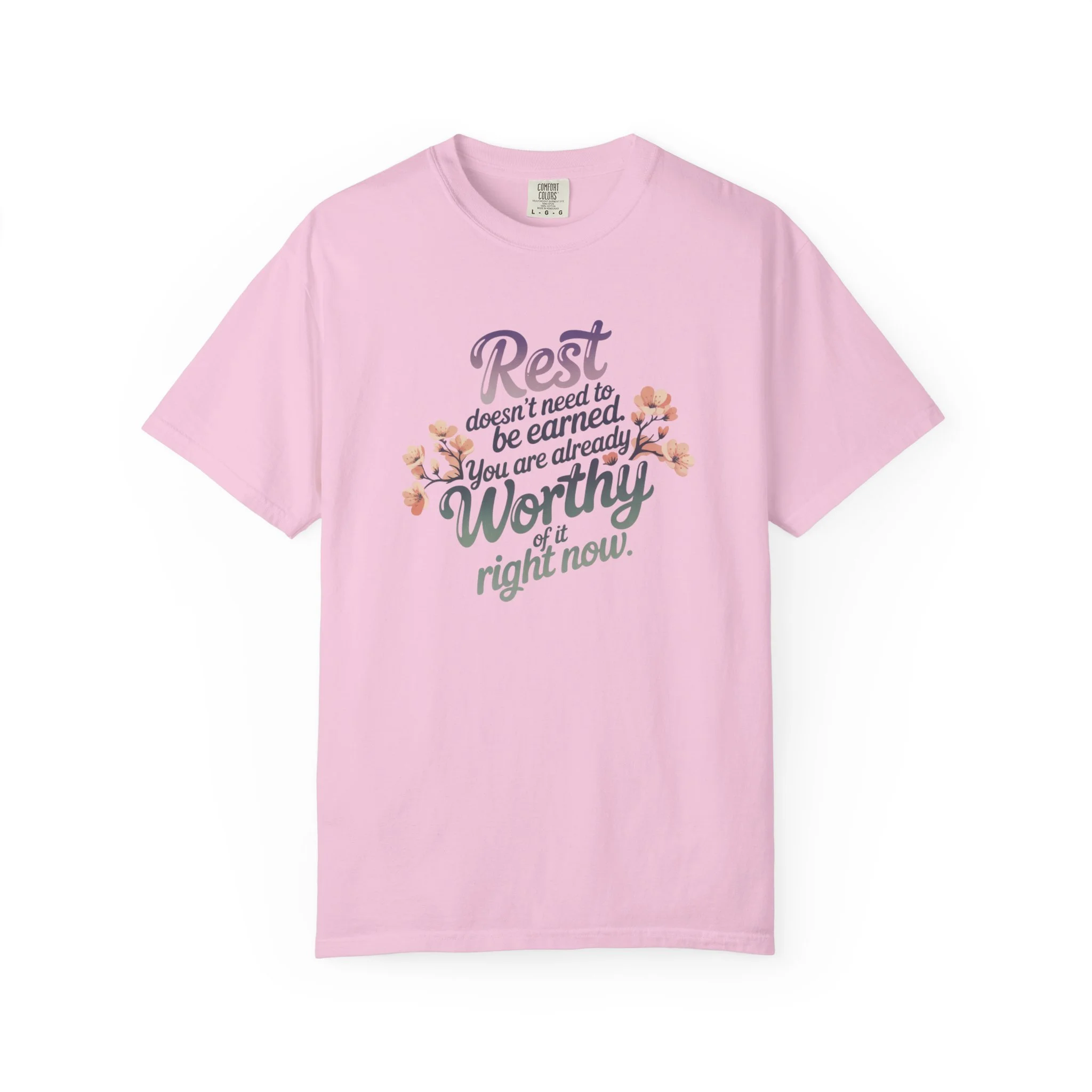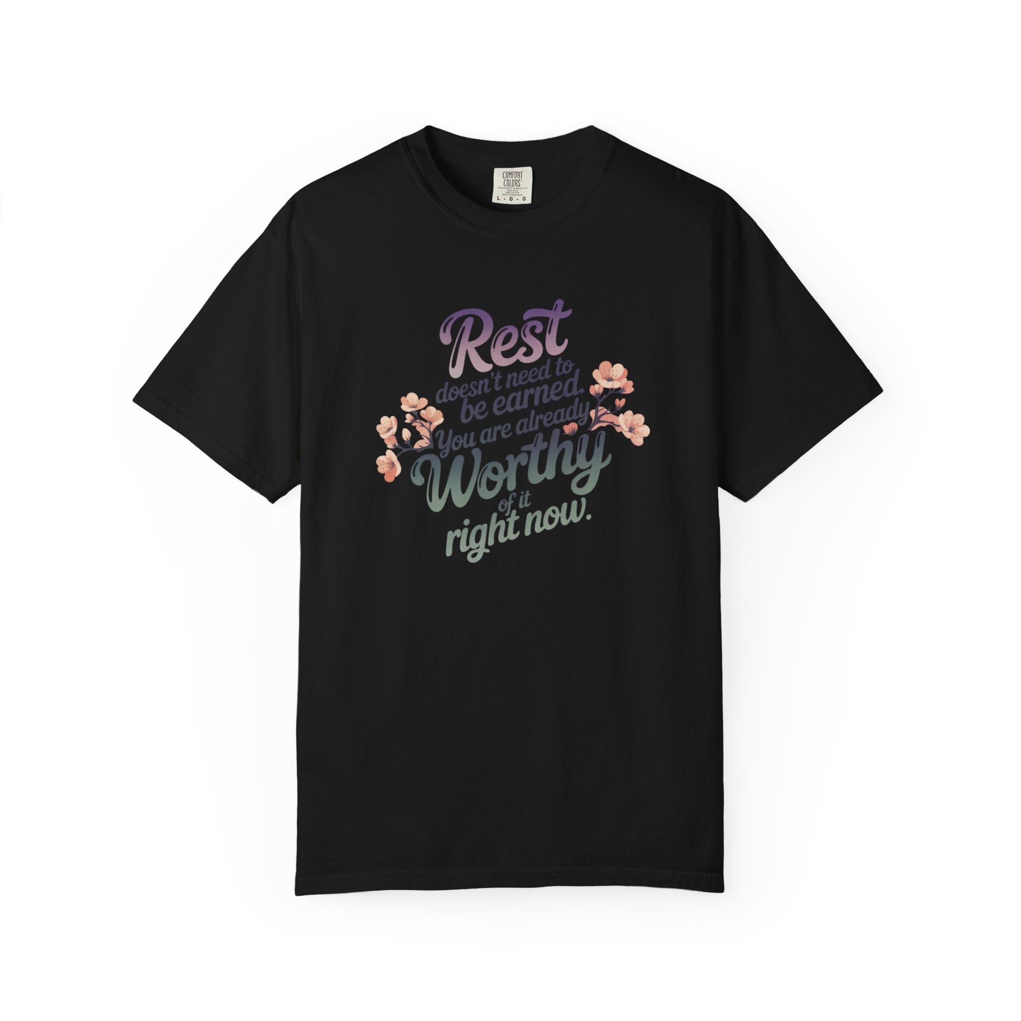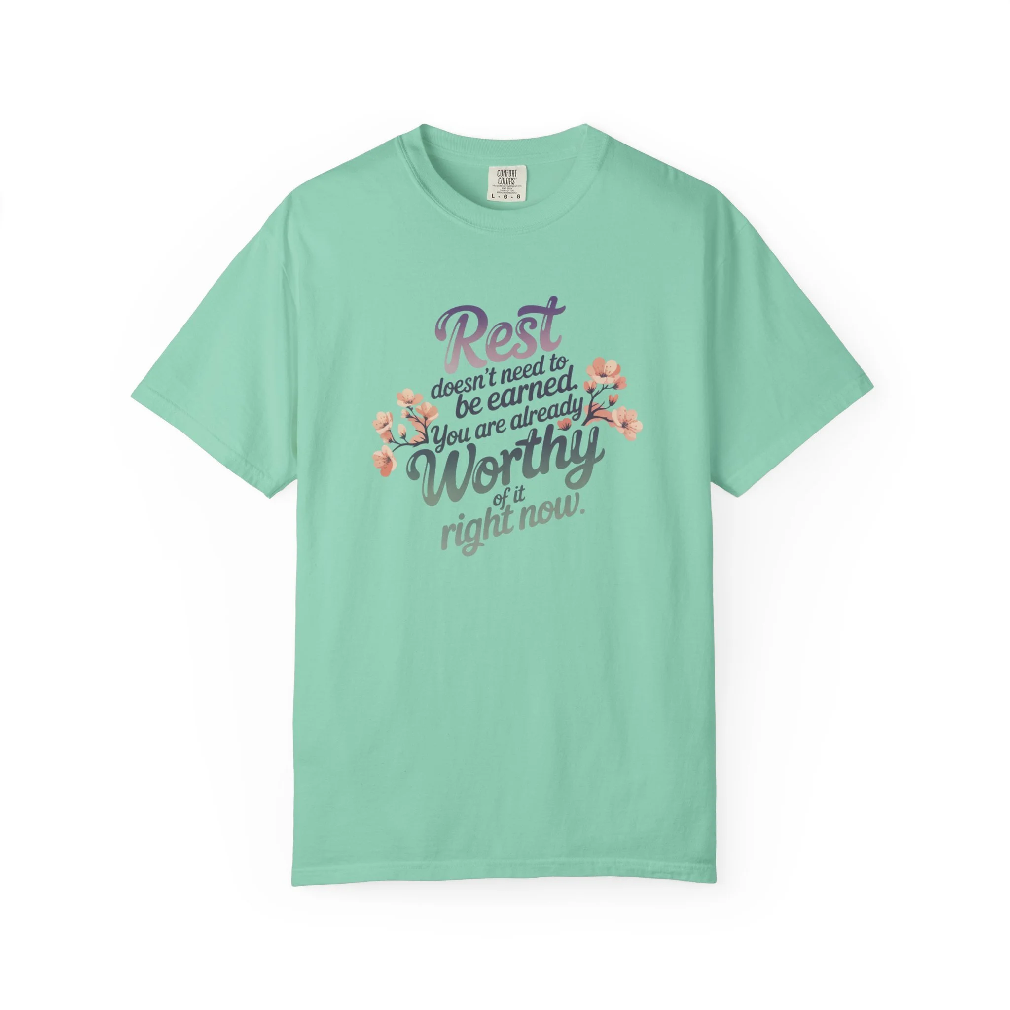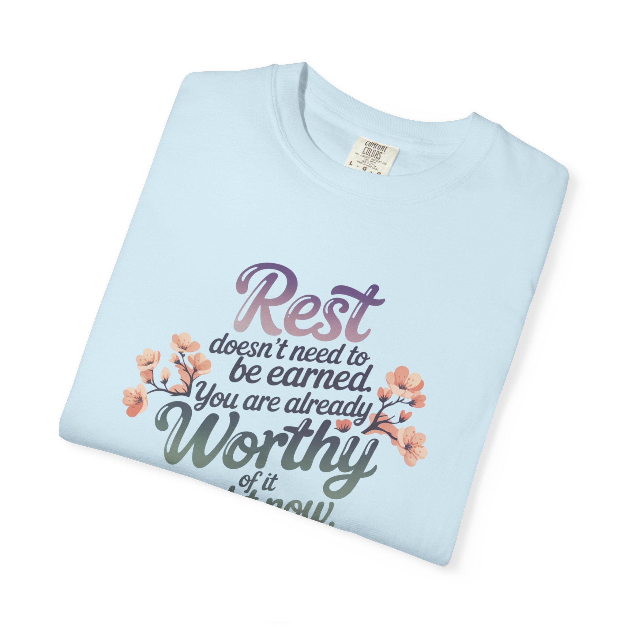Introducing the ultimate Unisex Garment-Dyed T-shirt, perfect for those who value comfort and stylish expression. This soft and inviting tee creates a relaxed vibe that seamlessly fits into your everyday life, whether you're lounging at home or meeting friends. Designed for anyone who embraces casual chic, it makes a thoughtful gift for birthdays or any occasion that calls for a little self-care. Celebrate yourself and the beauty of rest; this shirt is a reminder that you are worthy of taking a break—ideal for Wellness Days, Mental Health Awareness Month, or simply as a reminder during busy times. Available for both men and women, this versatile tee enhances any wardrobe with its comforting presence and classic crew neckline.
