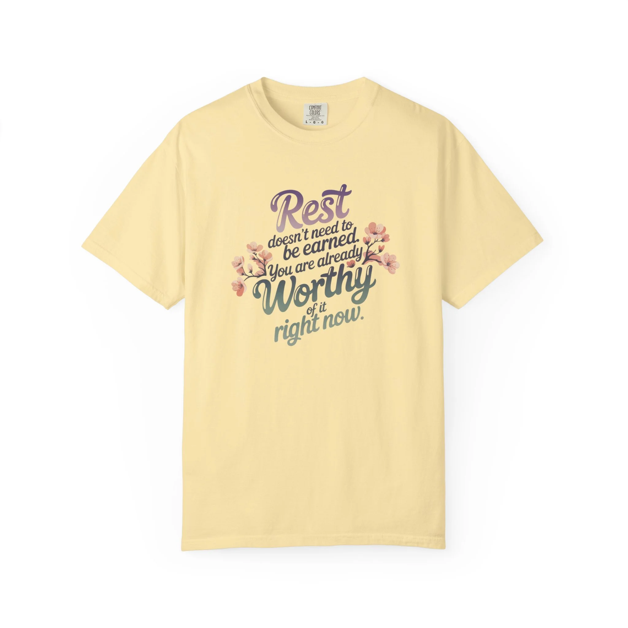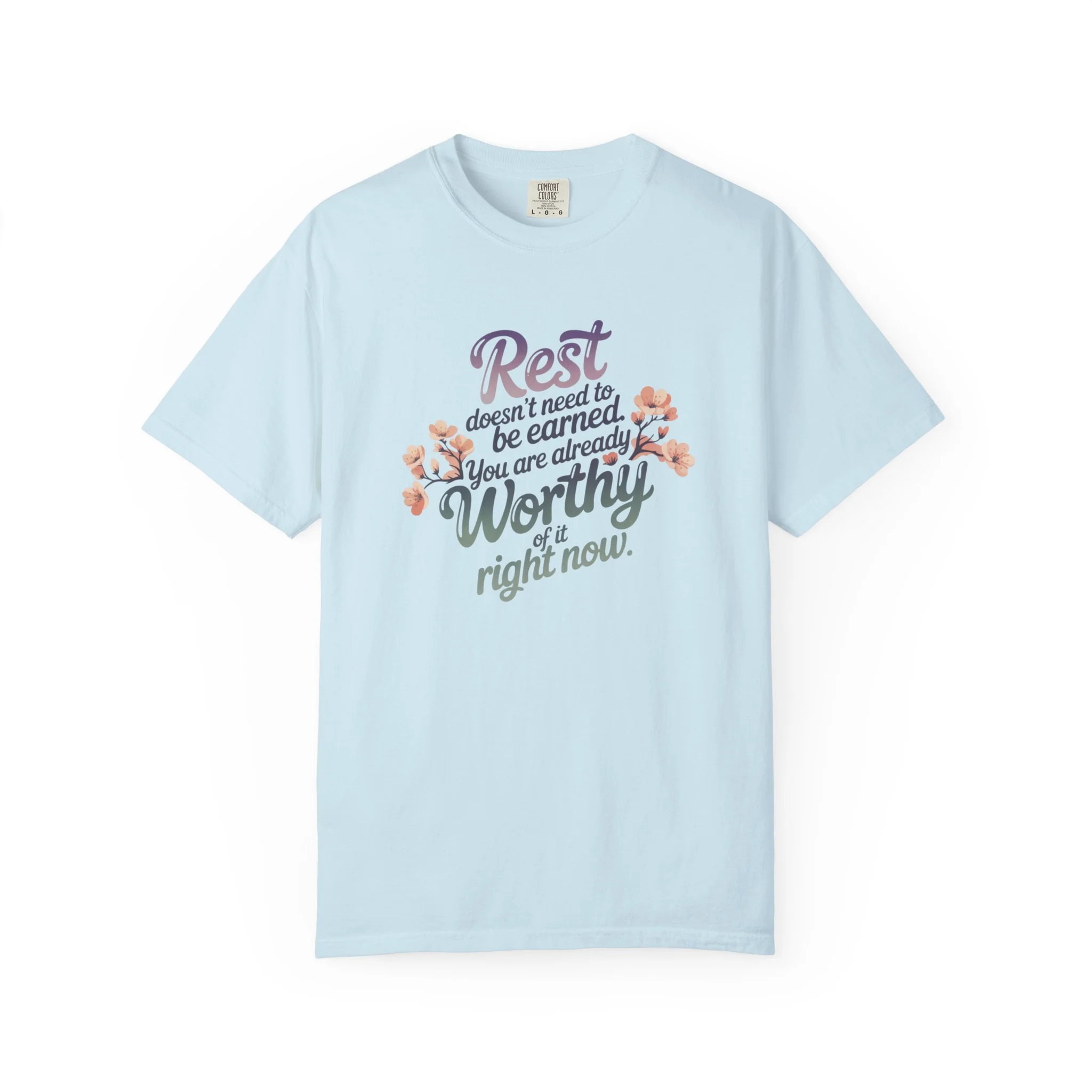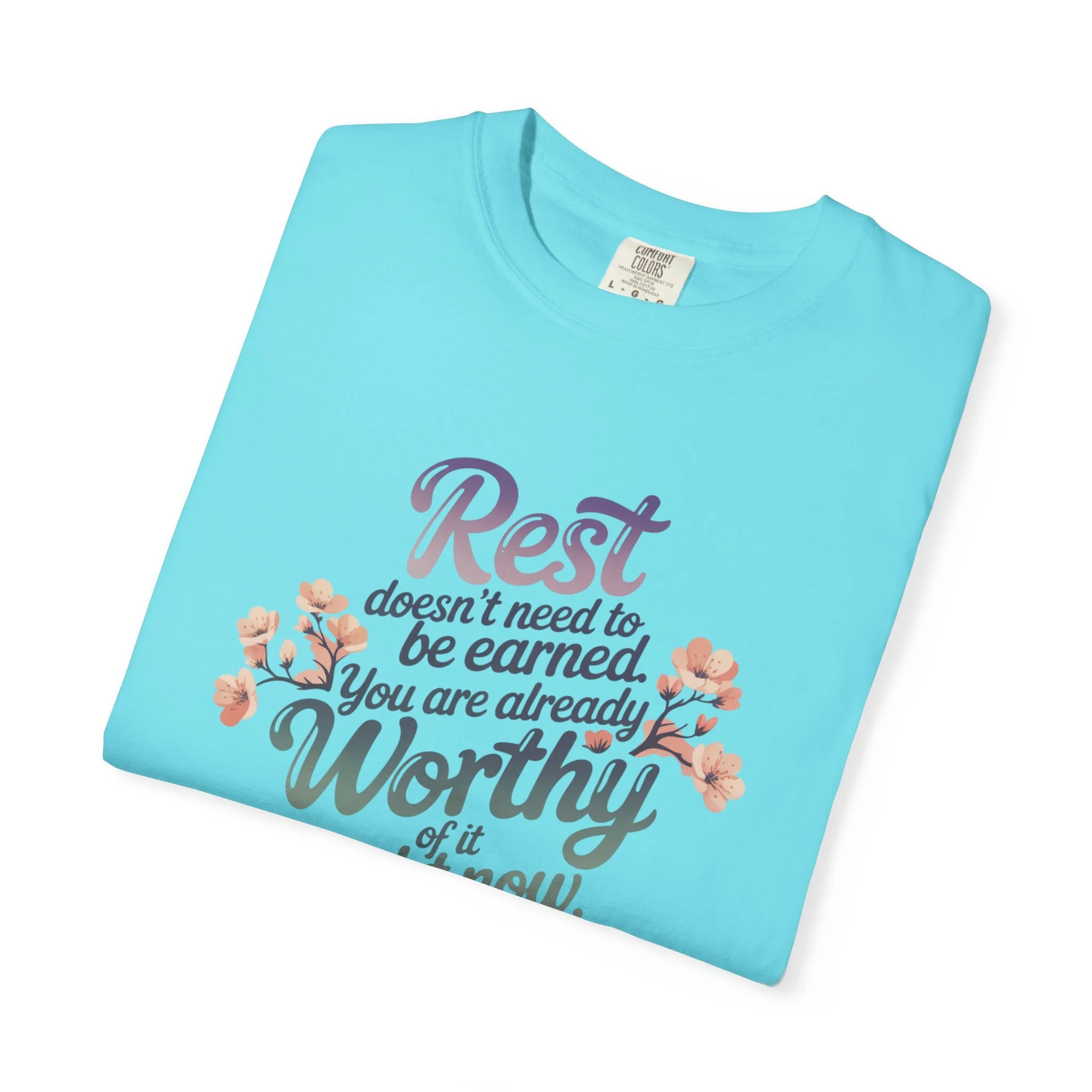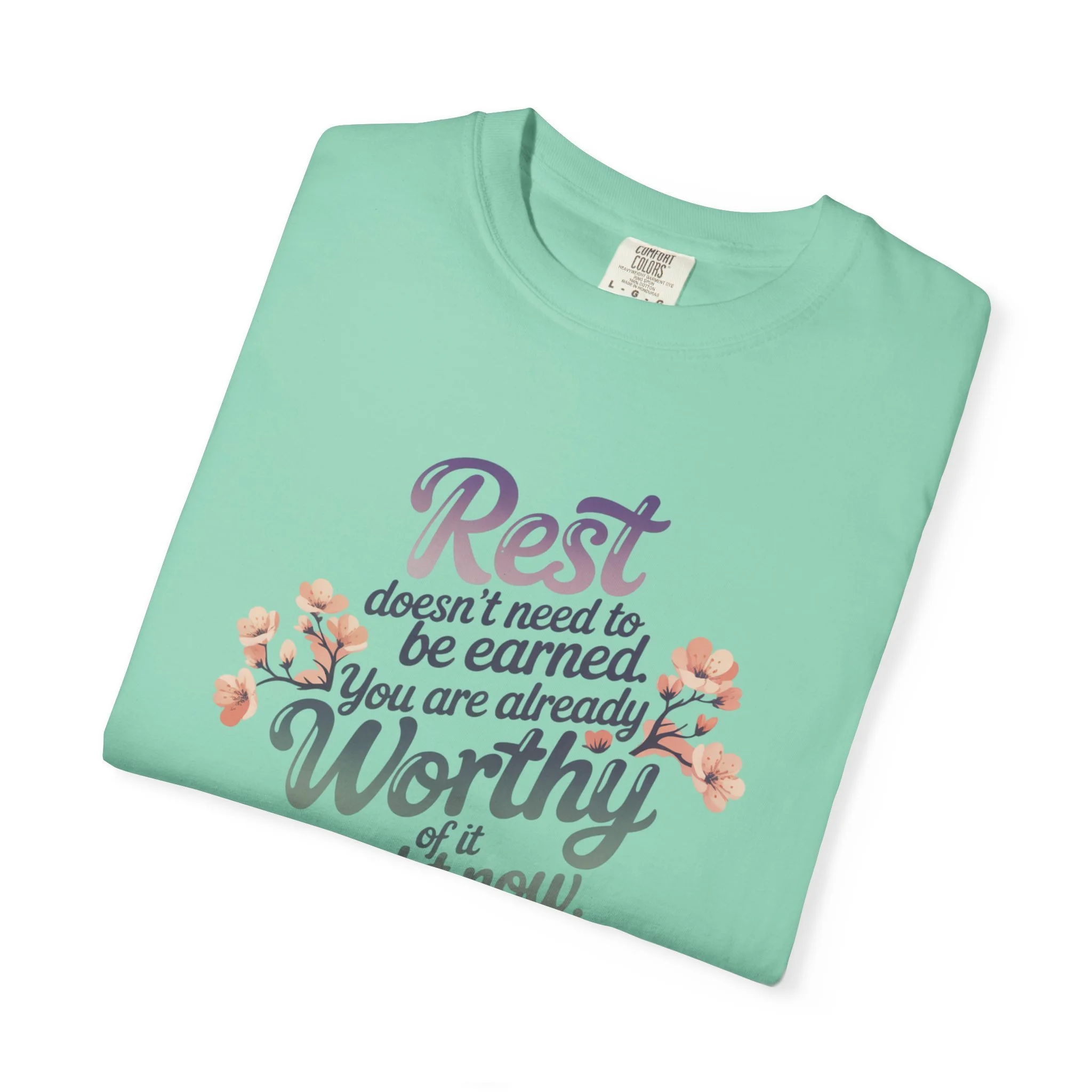 Introducing the ultimate Unisex Garment-Dyed T-shirt, perfect for those who value comfort and stylish expression. This soft and inviting tee creates a relaxed vibe that seamlessly fits into your everyday life, whether you're lounging at home or meeting friends. Designed for anyone who embraces casual chic, it makes a thoughtful gift for birthdays or any occasion that calls for a little self-care. Celebrate yourself and the beauty of rest; this shirt is a reminder that you are worthy of taking a break—ideal for Wellness Days, Mental Health Awareness Month, or simply as a reminder during busy times. Available for both men and women, this versatile tee enhances any wardrobe with its comforting presence and classic crew neckline.